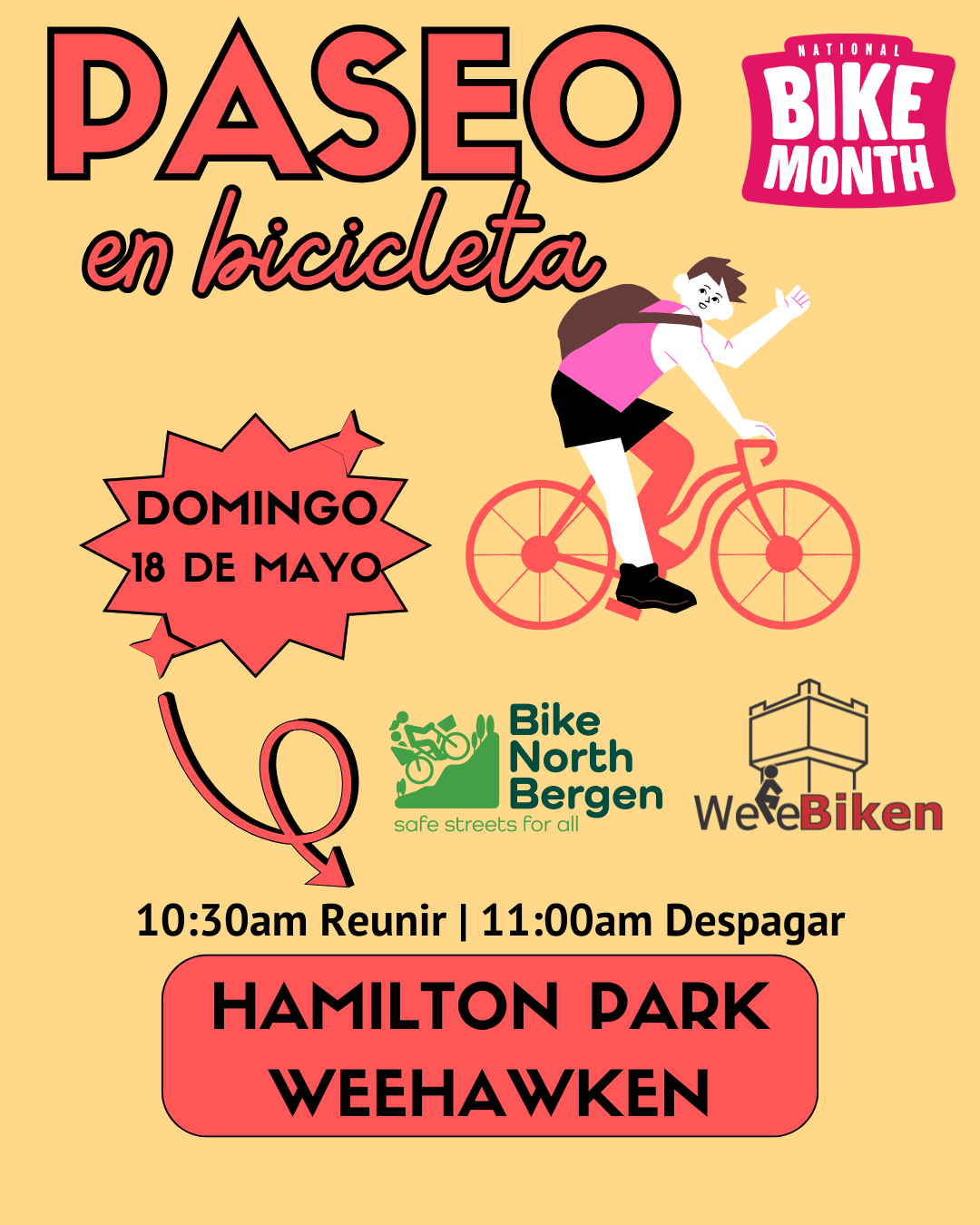 Bike North Bergen / WeeBiken Community Ride Sunday, May 18, 2025 10:30 AM 12:30 PM Hamilton Park Hudson Place Weehawken, NJ, 07086 United States (map) Google Calendar ICS Join us for our 2025 North Hudson rides!